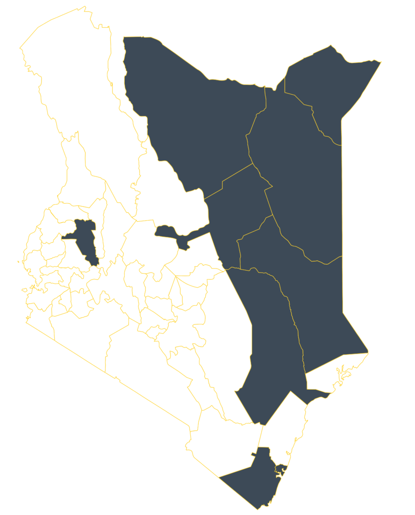 The Coast (Kwale, Lamu, Mombasa, Tana River), Northern and Northeastern (Garissa, Isiolo, Mandera, Marsabit, Wajir), Uasin Gishu